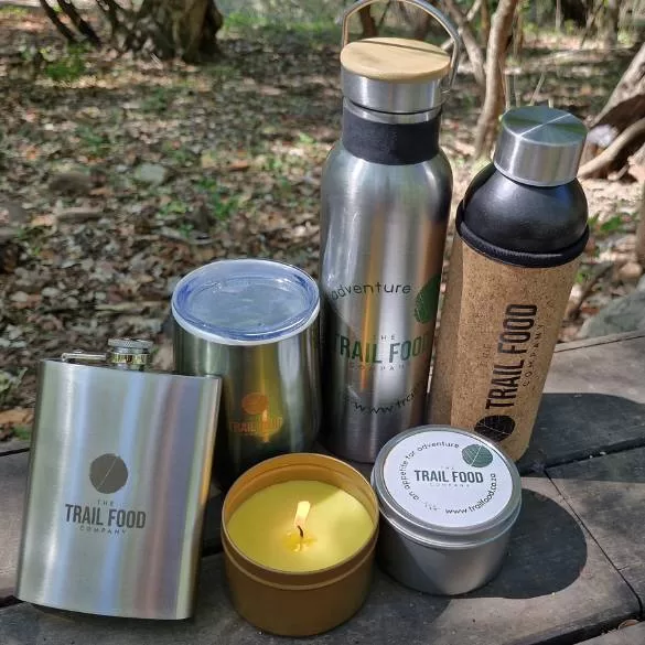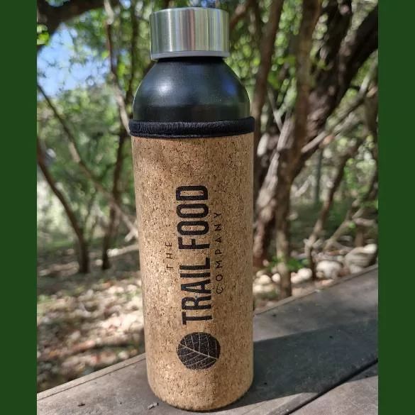 But wait, there’s more! This beauty comes snugly wrapped in a stylish neoprene and cork sleeve, keeping your drinks cool and your hands comfy. Plus, it’s branded with our Trail Food logo – because hydration deserves a touch of class!